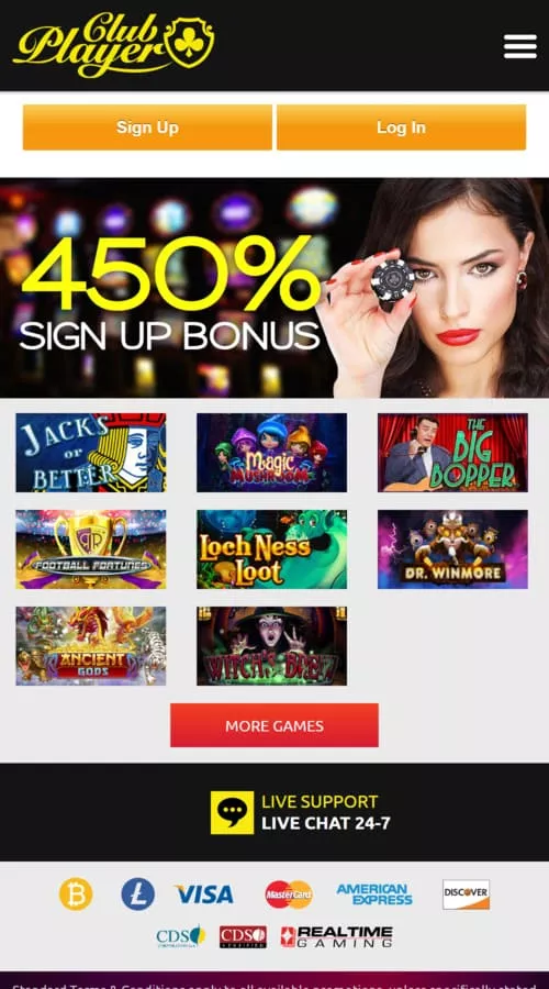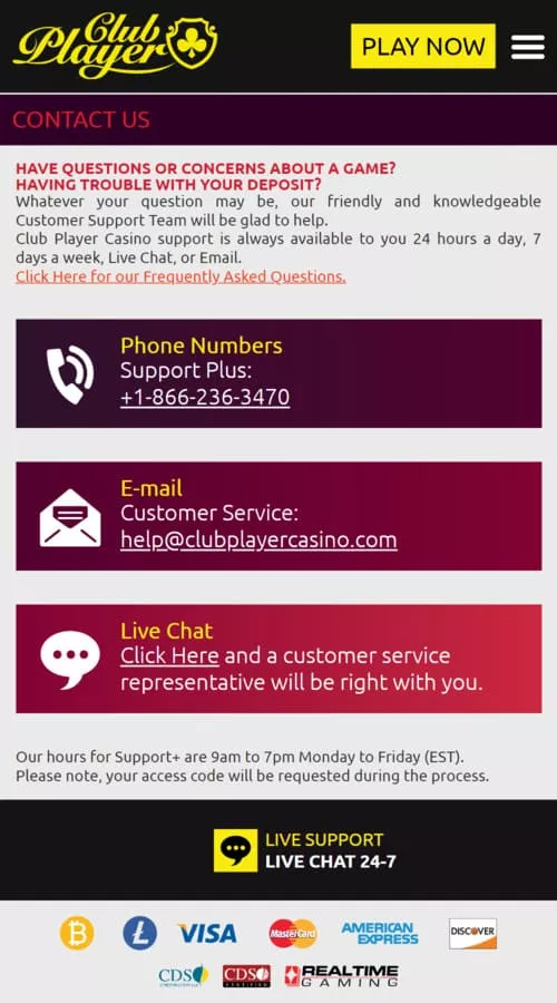 The customer support is reachable on the mobile version of the casino. Club Player Casino customer service can be reached by email or live chat. The live chat tool is accessible 24 hours a day, 7 days a week and will link you with a certified casino support person who can answer most of your queries about the casino.