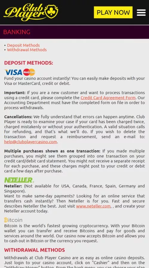 Players will discover that depositing with Visa or MasterCard’s credit and debit cards instantly funds their Club Player account, and this is by far the most common deposit method.