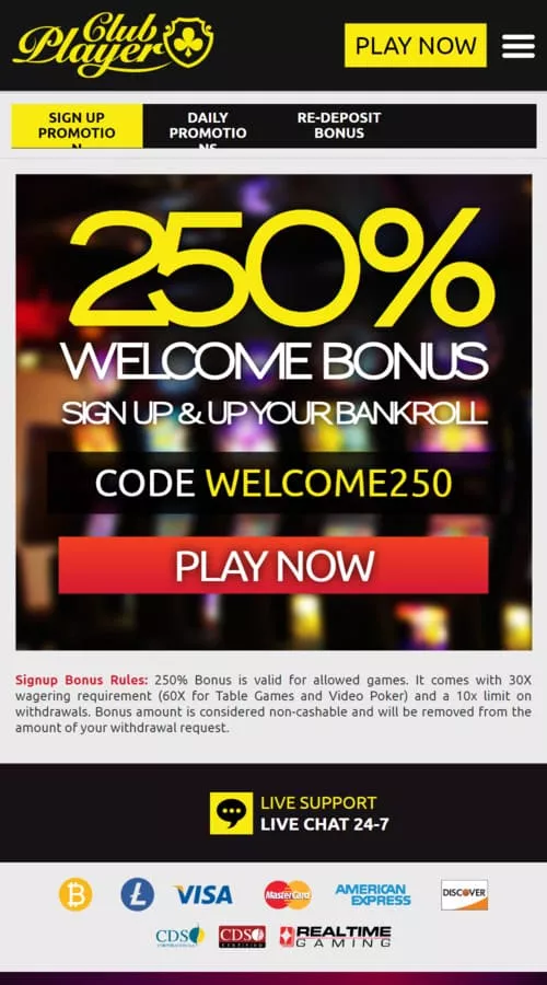 At Club Player mobile casino, getting off to a strong start is straightforward. When you make your initial deposit, you can get a 450 percent bonus. It has a 30X wagering requirement (60X for Table Games and Video Poker), as well as a 10x withdrawal limit. The bonus will be deducted from the amount of your withdrawal request because it is non-cashable.