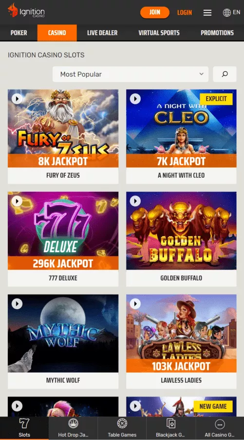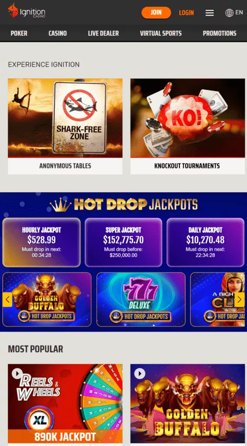Another impressive feature of Ignition Mobile is that it hosts over 300 mobile games to suit the needs of a wide range of gamblers. Most of its software originates from Rival Gaming, but there are several other options from Genesis Gaming as well as RealTime Gaming. The platform also hosts several proprietary titles, like Golden Buffalo and Instant Inferno, that are only available at Ignition and its sister sites.