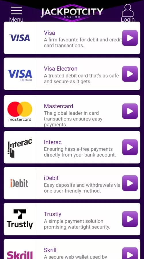 Jackpot city has several payment methods that allows players to use different options for deposits and withdrawals. You have options for bank cards, eWallets and bank transfer. These include Mastercard, Visa, Skrill, EcoPayz, Neteller, PayPal, AstroPay and Banwire transfer.