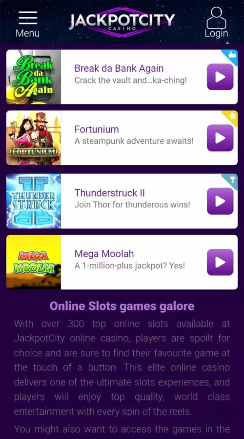 Jackpot City hosts over 500 games with most of them being slots. On the mobile appmost of these games have been optimised for mobile compatibility so you will not miss out on many of your favourite desktop games. These include a variety of titles for slots, table games, video poker, progressive jackpots and live dealer games.