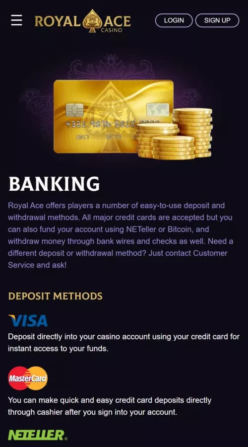At Royal Ace app casino, you will find a wide range of banking methods available. These options include both fiat and cryptocurrency. If you are looking to make a deposit, you can make use of Neteller, debit/credit card, BTC, and Bitcoin.