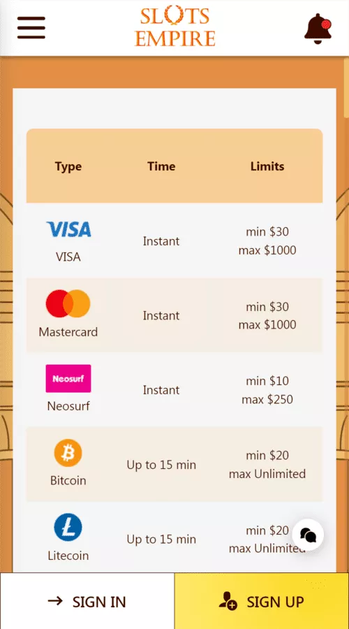While Slots Empire could do better when it comes to variety, the deposit methods are okay; they are swift, secure, and convenient. The site has incredibly flexible limits, so there’s not much to rant about. Most users feel that it wouldn’t hurt to have options such as e-Wallets and other cryptocurrencies. The available options include NeoSurf, Gift Cards, MasterCard, Visa, and Bitcoin.