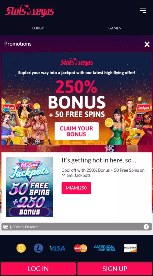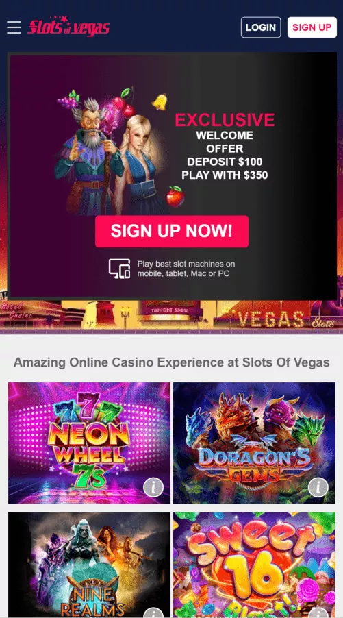 Since 2004, the Slots of Vegas Mobile casino has brought its patrons’ joy. It is now your turn to benefit from your choice of unique existing player promos, welcome packages, numerous VIP benefits, and more perks.