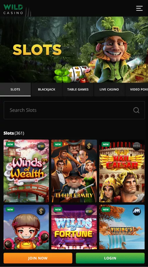 One of the main factors gamblers consider when choosing a mobile gambling casino is the quality and quantity of its games. Wild Casino download features more than 200 titles from top game studios in the industry. Once you open the app and log into your player account, you will find five game categories with high-quality software. Below is a brief rundown of the games available at Wild Mobile.