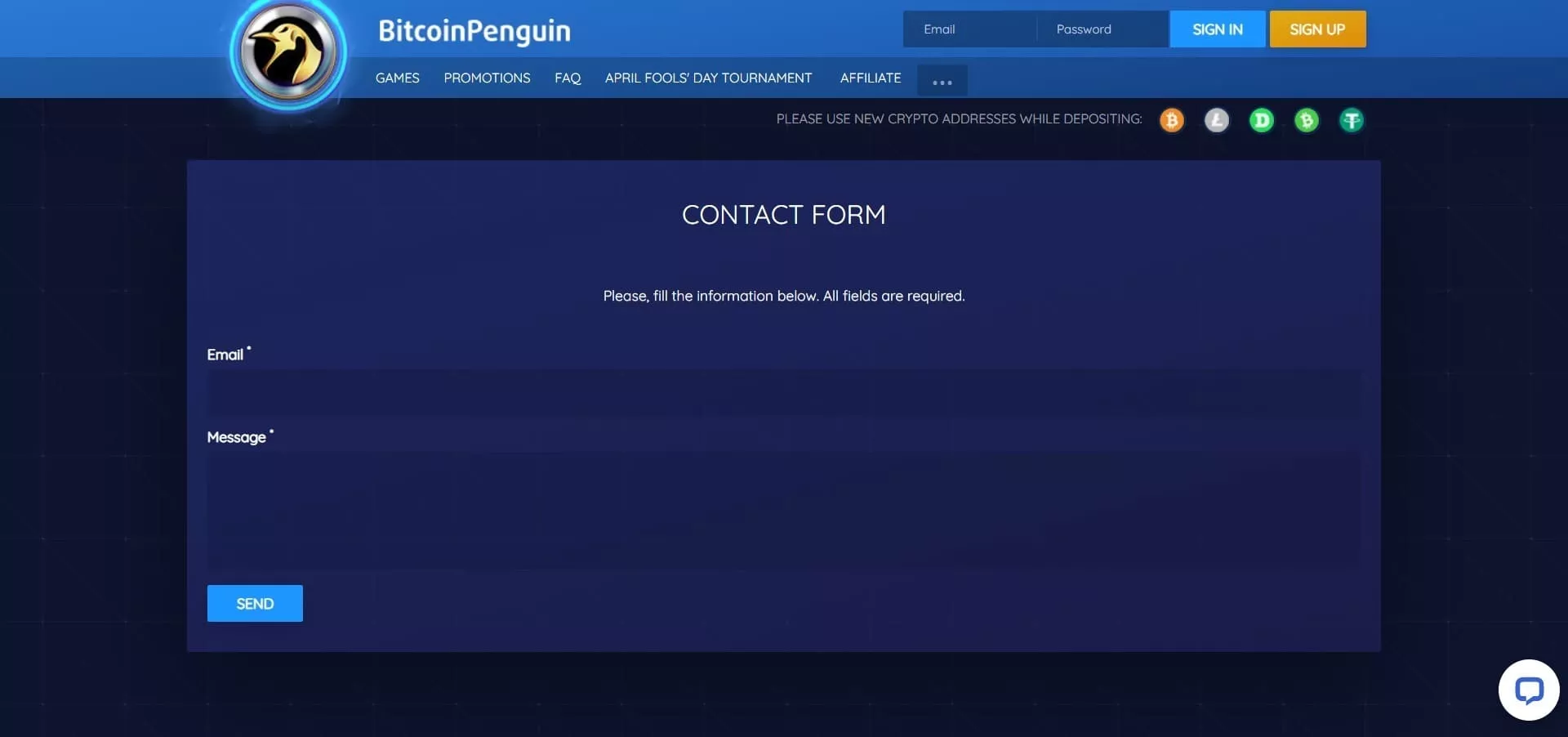This Bitcoin Penguin Casino review clearly shows that there are both positive and negative aspects to this bitcoin casino. The non-responsiveness of live chat is one of the problems that need immediate attention. Live chat is not always accessible by customer service representatives. The slow contact form is the best way to reach customer service representatives.