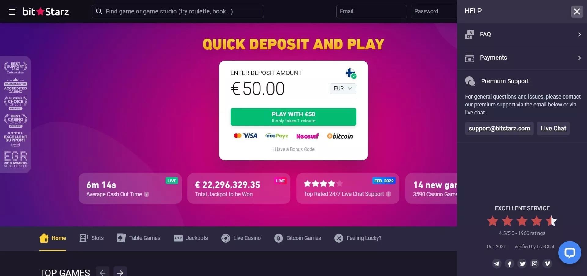 BitStarz’s customer support choices are unique, as they offer methods that make it easy for their players to get in touch. First, they provide live chat support, which is necessary for today’s online gaming industry. They also offer email and social media assistance through Twitter and Facebook.