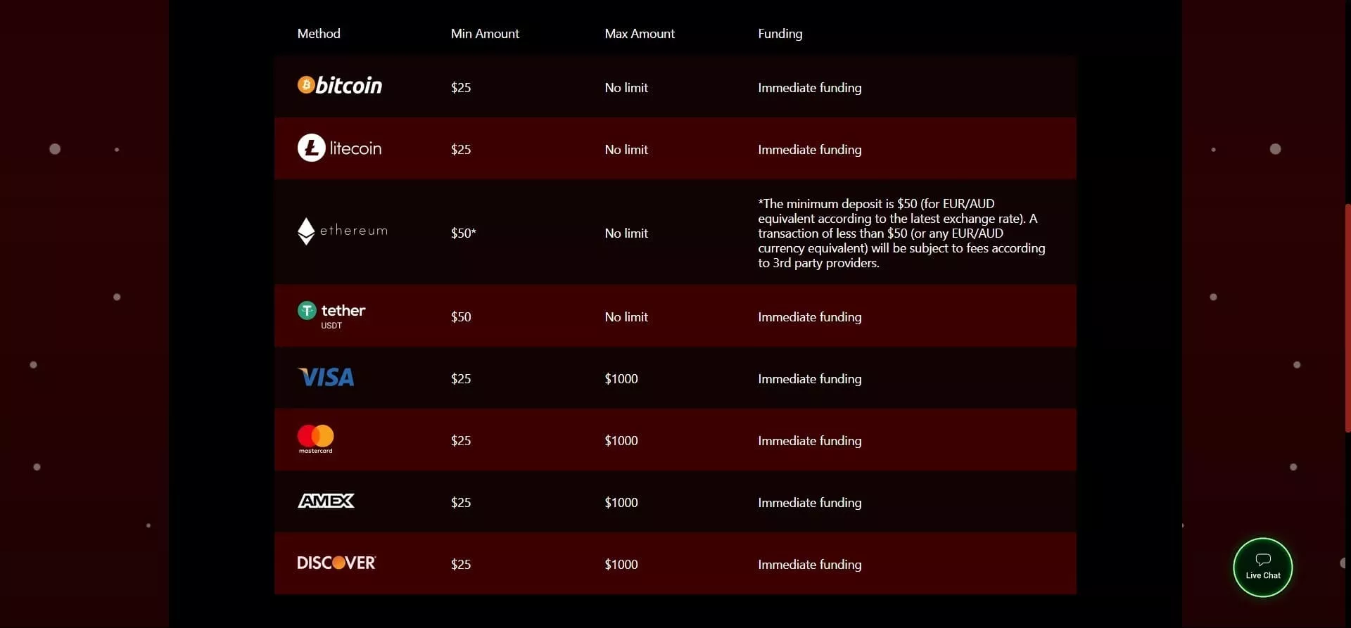 We offer the following deposit methods: Visa, MasterCard, American Express, Discover, Bitcoin, Litecoin, and Ethereum. The minimum deposit is $25 ($100 for Ethereum), while the maximum deposit is $1,000 (infinite for BTC, LTC, ETH, AmEx, and Discover).