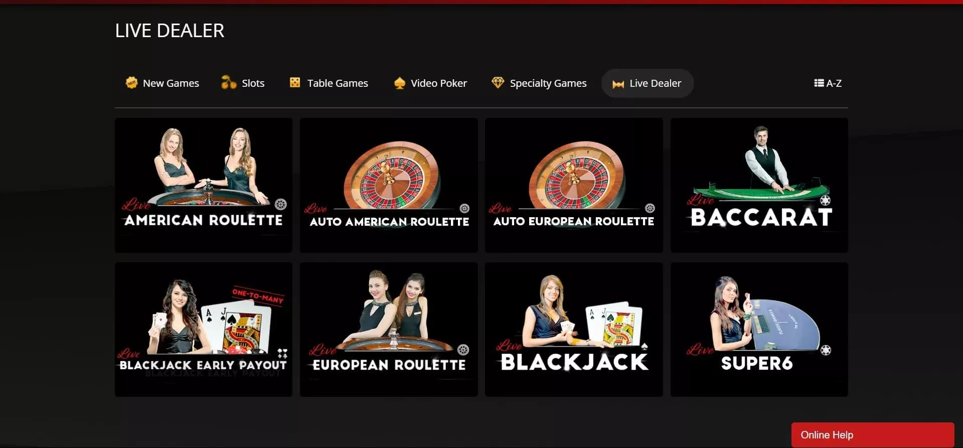 Live dealer – 4 games include Super 6, Blackjack, Baccarat, and Roulette.