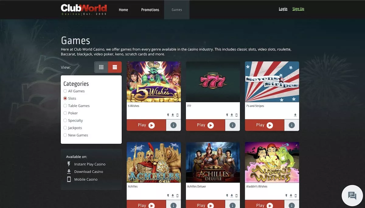 Both downloading and instant play versions of Club World s casino software are available. If you prefer to play directly in your web browser from the ClubWorld website, the instant play version is a fantastic choice. However, if you prefer to have access to your favorite games right from your desktop, downloading the software client is the way to go. In either case, you will have total access to more than 120 games.