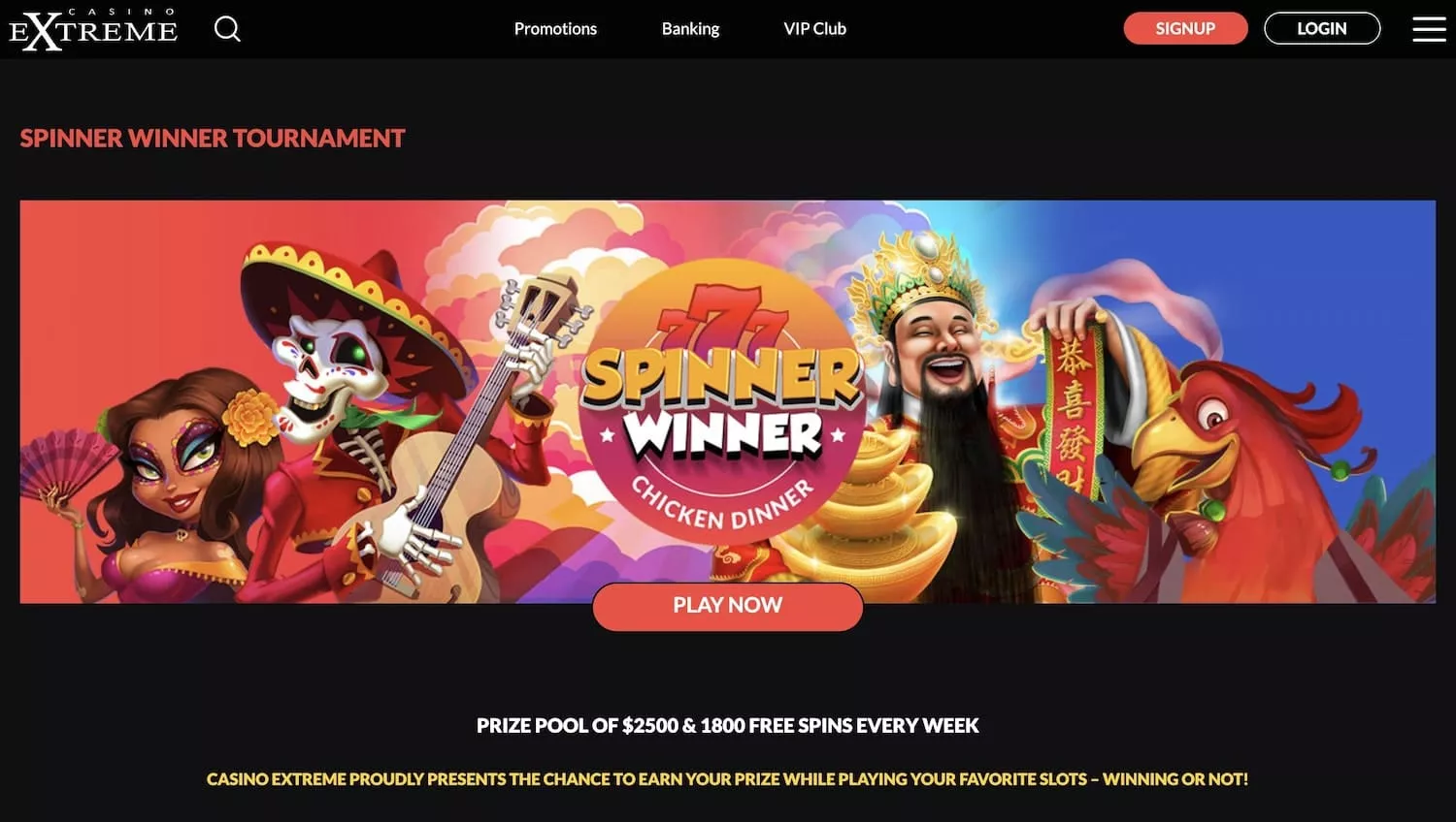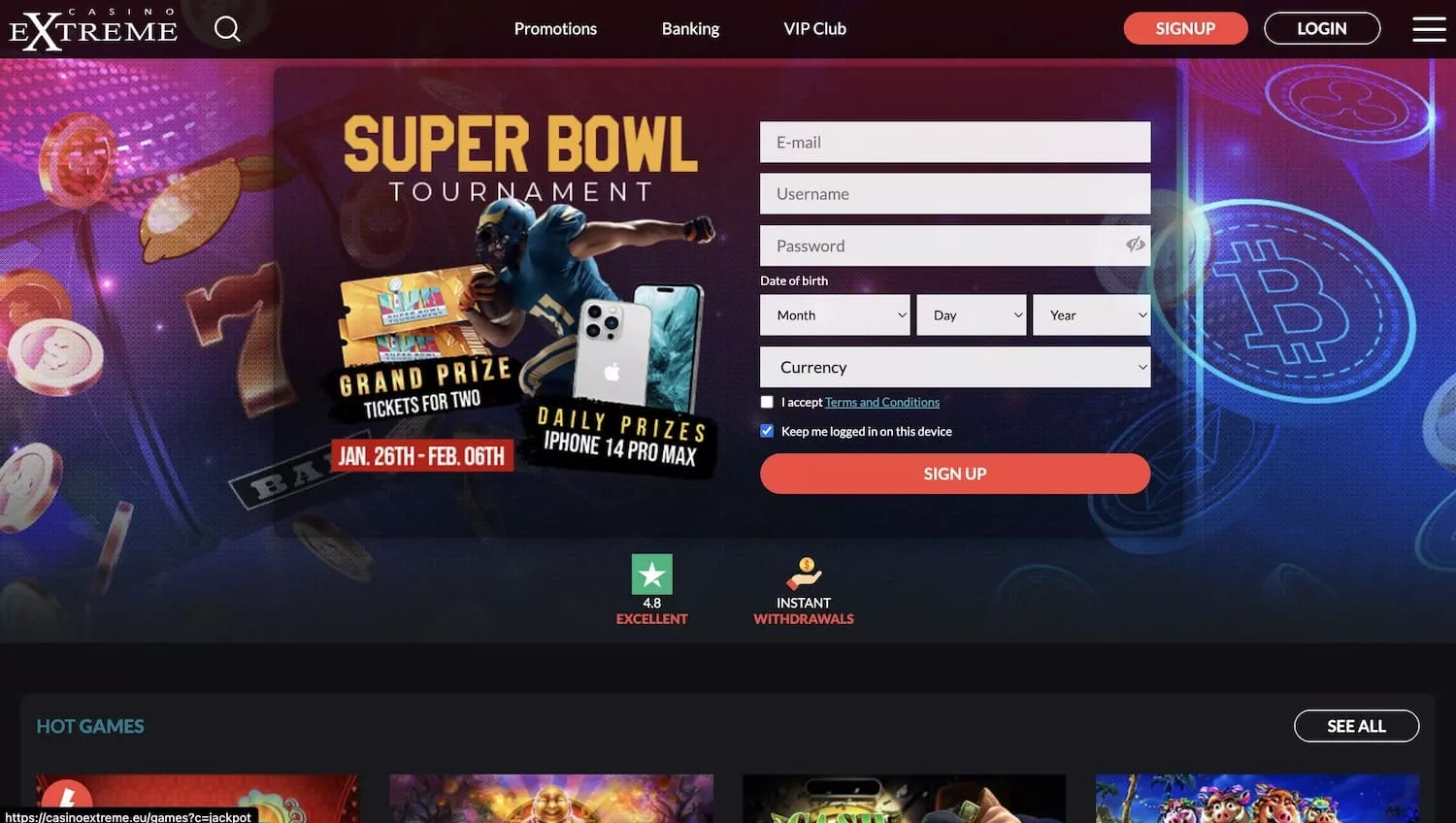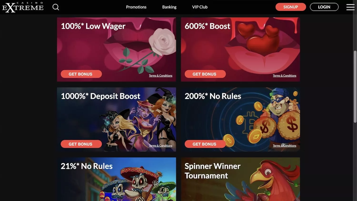 If you scroll down the homepage, you will see all the top games provided by RTG, new titles, and jackpot games. If you sign up, you can get an Extreme casino bonus with 50 free spins for the game. There are lots of other bonuses and promotions for new and existing players. The VIP club offers extra perks for loyal users.