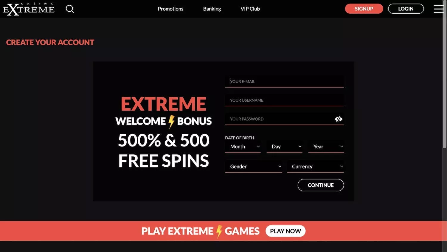 Extreme Casino has a colourful theme with reels and symbols of slot machines in the background. It is easy to navigate the site and find the Games selection, promotions, banking information, VIP Club, and menu. In the top right corner are Extreme casino login and registration buttons. It is an easy and fast process to start with the casino Extreme. Just follow these steps for registration: