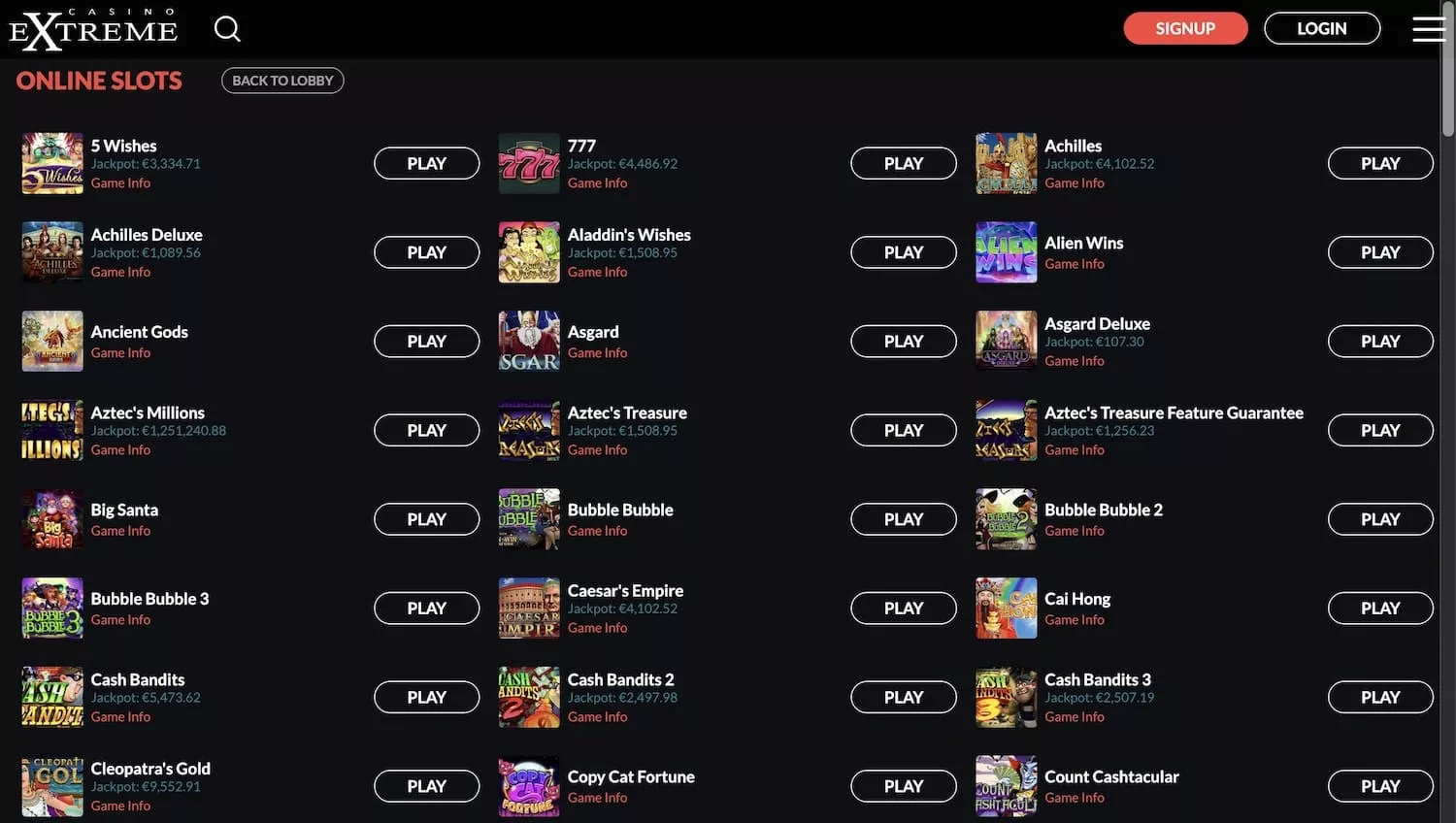 Extreme casino slots count over a hundred titles, with several popular games like Asgard, Achilles Deluxe, Bubble Bubble 2, 777, Cash Bandits, and many more. Players can try an Extreme casino instant play function without registration and check their abilities in gaming. Or, if you are ready to play for real money, sign up, play and win.