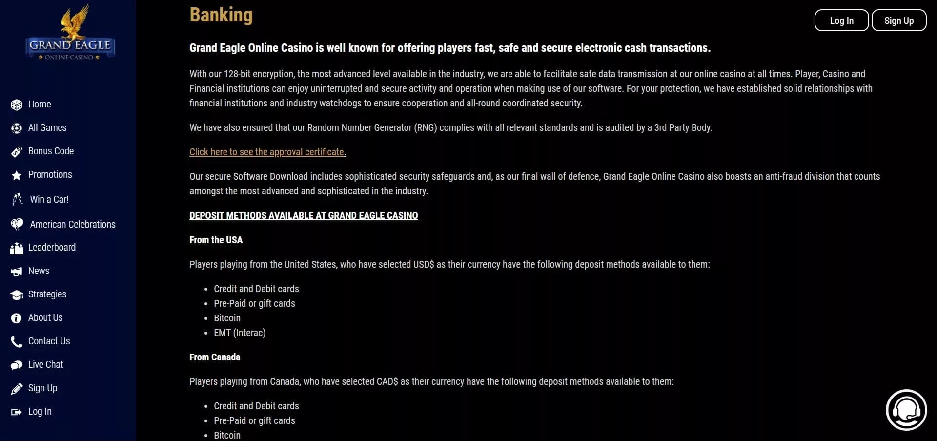 Once the verification is finished, players can proceed to the deposit section. At Grand Eagle, deposits can be made with: