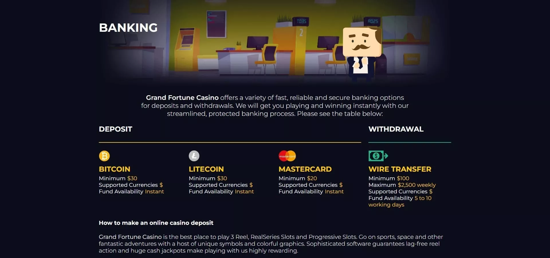 Grand Fortune Casino offers a wide range of payout methods. The list includes: