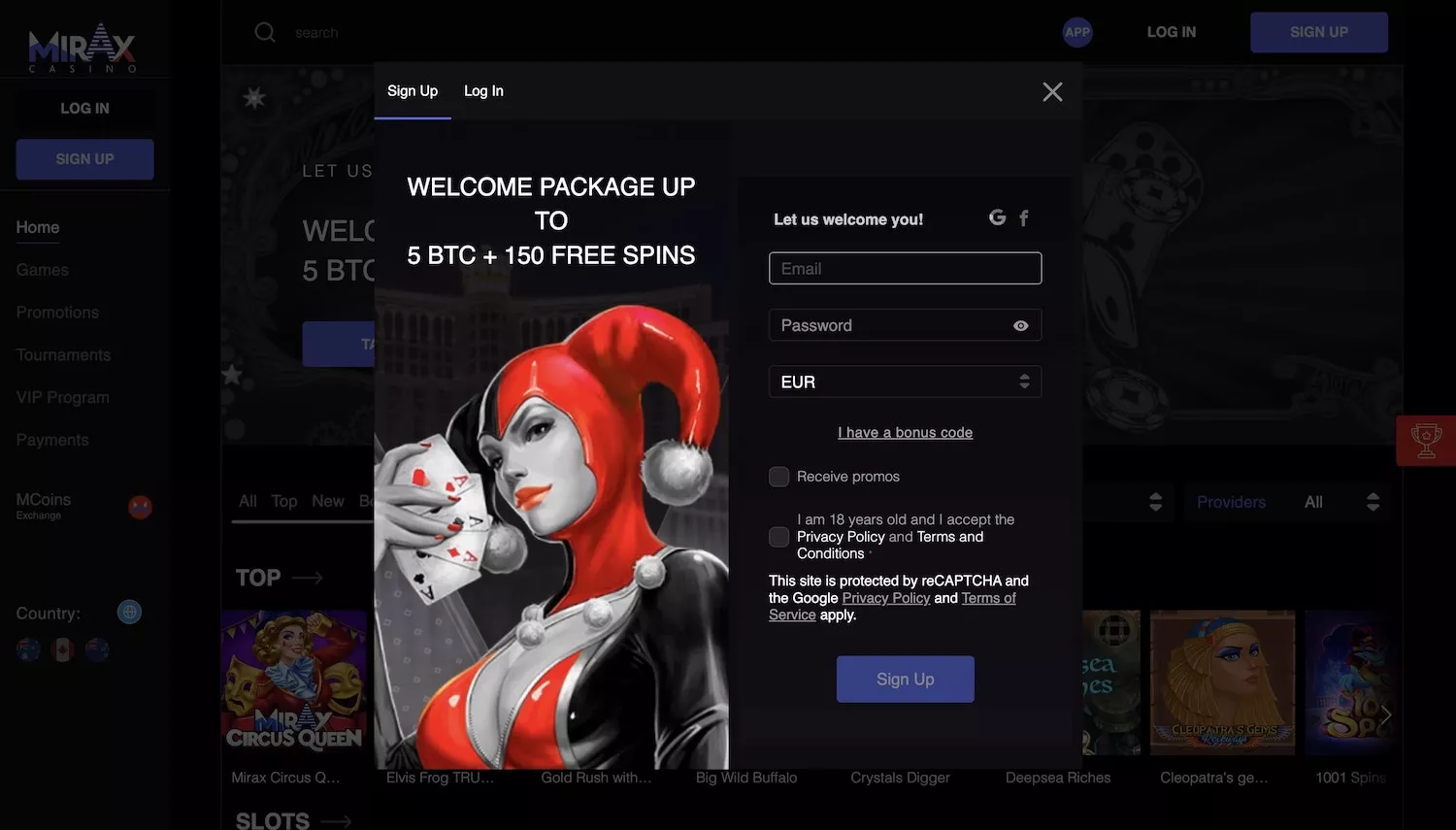 Want to create an account at Mirax Casino but don’t know where to start? Then just head over to the home page. Find the blue Sign Up button and in the form that opens, enter the required information. After that, be sure to send an email to the email address you provided when you registered, as we’ll send you an email with the activation link.