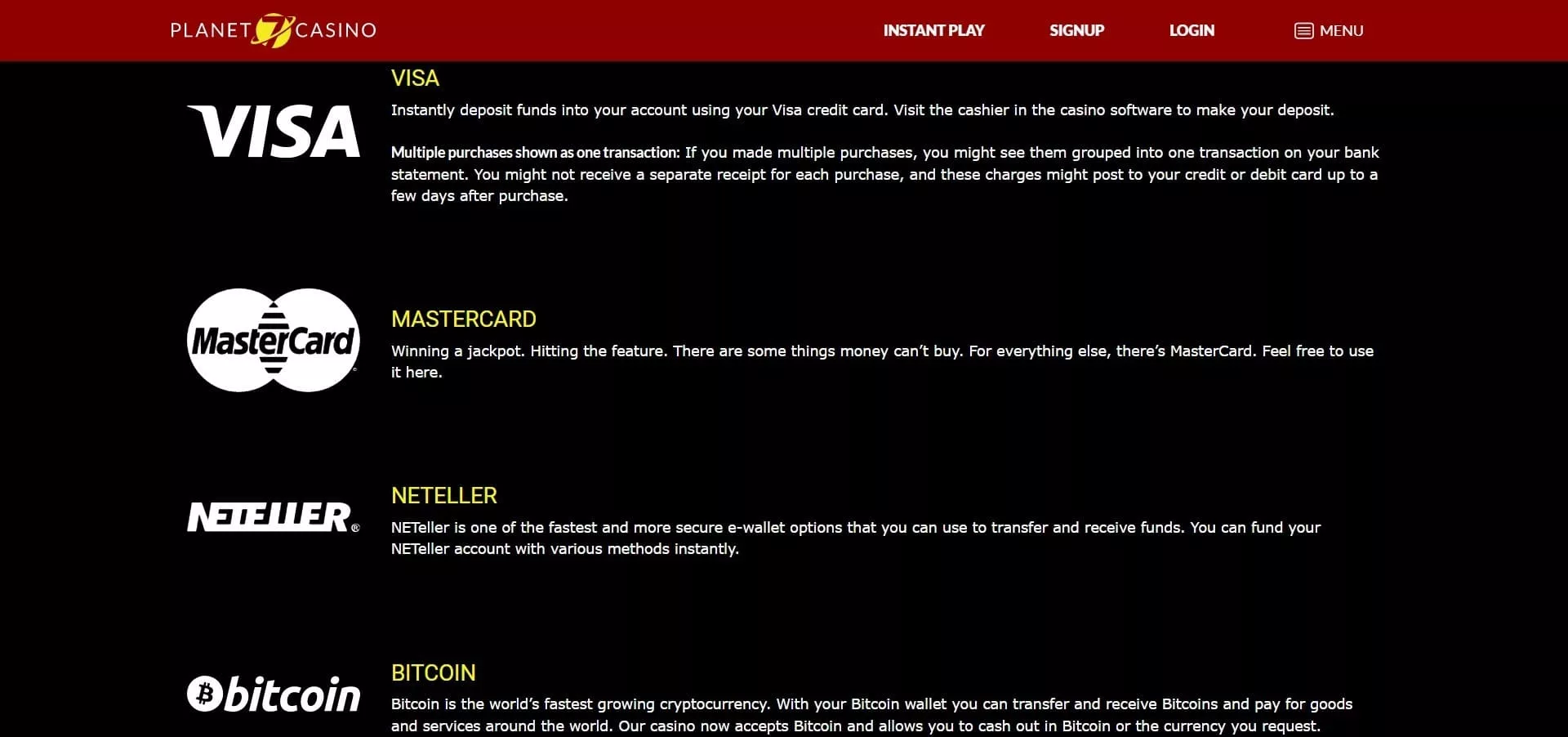 The payment methods available at this gaming site include credit/debit cards, e-wallets, and cryptocurrency payments. Just like many other iGaming sites, the use of cards for deposits is the most popular at Planet7. The popular cards accepted at this gaming site include Visa, Mastercard, American Express, and Discover.