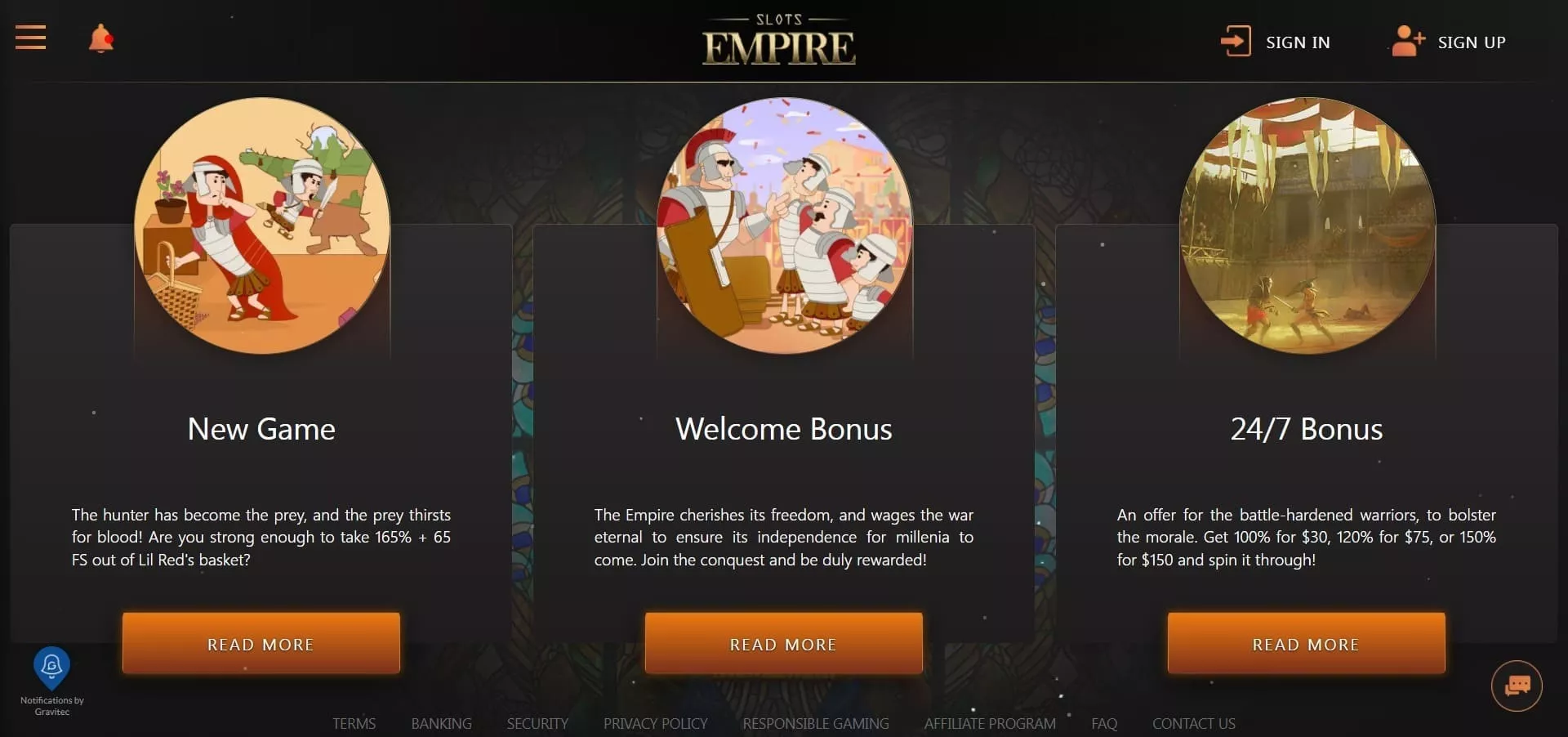 you love the Roman Empire theme, then Slots Empire Casino is just the place for you. Complete with artistic renditions of gladiators, sword and shield symbols, this Casino transfers you right into the world of gladiators. Its safety and security is a factor you’ve have to love. As opposed to the 128-Bit SSL encryption used by many platforms, this provider applies 256-Bit SSL encryption.