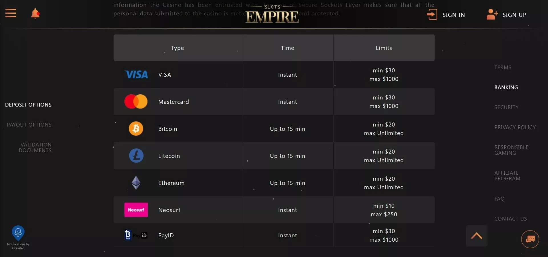 There are different methods to make deposits and withdrawals in Slots Empire. Some methods are for depositing only while some are for withdrawal only. All of this has been meticulously explained below.