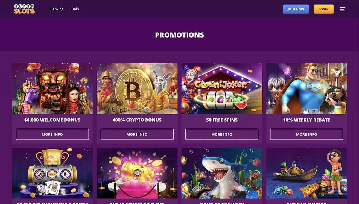 The same as all of its sister casinos, Superslots Casino focuses primarily on the Super Slots casino USA players and offers real-money play using deposit options like Bitcoin, other Crypto, and major credit cards. Although the 45x wagering requirement to clear it tempers that a little, the Superslots welcome bonus ceiling is very substantial$6,000. Casino Super Slot offers a Super slot No deposit bonus on sign-up, a Super slot Free spins to play slot games and Super slots bonus codes to enjoy your experience. There are many more facts you can learn about this gambling site by reading the rest of our review of super slot casino.